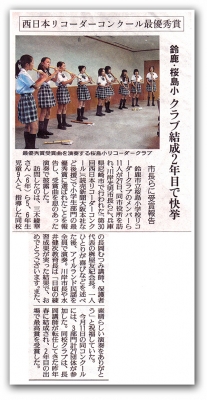 桜島小リコーダークラブが、西日本コンクール(9月11日)で最優秀賞に輝き、鈴鹿市長らを表敬訪問したことが新聞に掲載されました。