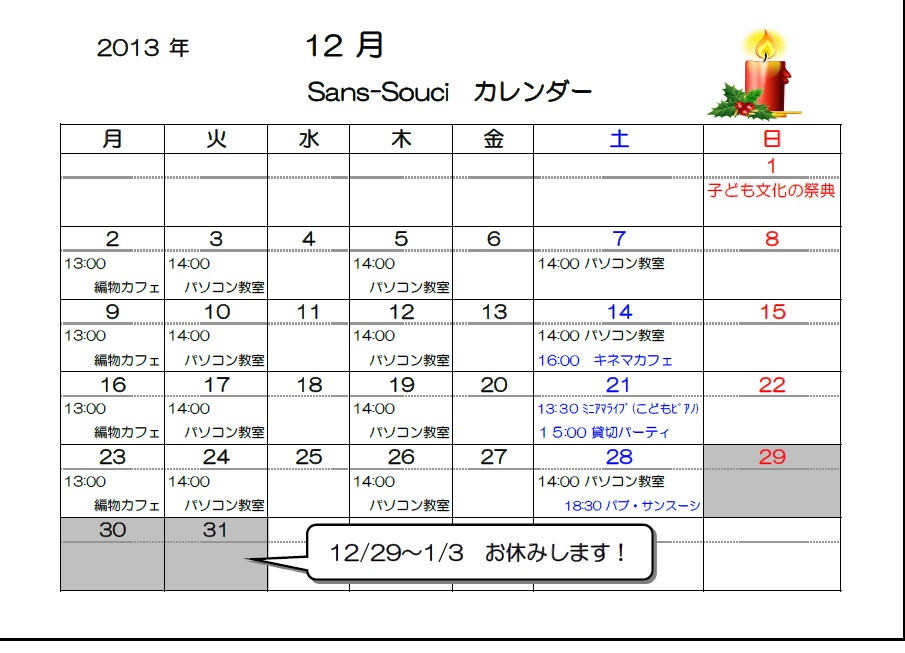 12月29日(日)〜1月3日(金)、お休みします。