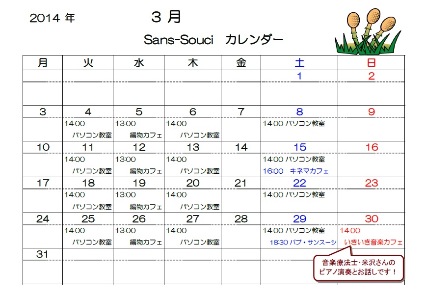 3月のサンスーシのスケジュールです。